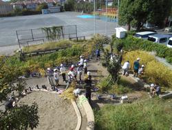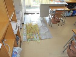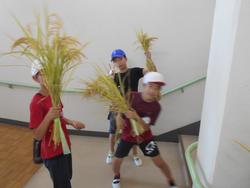 5年生が総合的な学習の時間で米作りを行っています。5月から取り組み、夏休みも水やりをしてお世話をした稲が米を実らせました。地域の方にも来ていただき一緒に稲刈りを行いました。教室に戻ってきた5年生が嬉しそうに稲を見せていました。