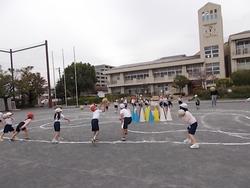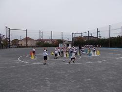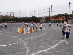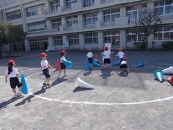 1年生がまとあてのゲームを行っていました。1人1つずつボールをもって、準備は自分たちで行い、線の外側からまとを倒そうと力を込めて投げています。まとはモンスターや魔物、ボールで倒すというストーリーです。たくさんの勇者がボールでたくさんの魔物を倒していました。中央には段ボールのボスがいて、それを守るようにコーンの魔物がいます。