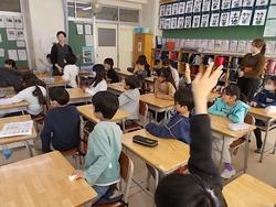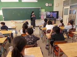 外国語活動では対話がとても重要です。いつもは外国語のAETや担任の先生との対話、子どもたち同士での対話などを行っています。来年度から行われるのがオンラインでの対話です。フィリピンのマニラに住んでいるAETとオンラインでの対話を4年生が行いました。「好きな色を教えて」「好きな食べ物は」「マニラと日本は2時間の時差があるよ」4年生も手を挙げて、たくさんの対話がされていました。