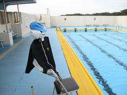 金曜日。プールに怪しい人影が・・・。何かと思いきや、案山子が立てられていました。プールに来る鴨対策の案山子です。鴨池公園が近いからか、つづきの丘小学校のプールは鴨の休憩場となっています。いろいろな落し物があるので、プールを使用している時期には、なるべく近づけないように努めています。案山子さん。土日しっかりと見守ってね!!