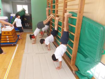 低・中学年は「パーの手」と「おへそをみる」ことを心がけて練習し、とても上達しました。高学年はまっすぐ足を伸ばすことを心がけて練習し、きれいなフォームで壁倒立ができました。