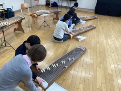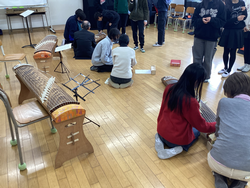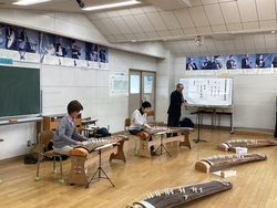 青葉区三曲協会の先生による、尺八と箏の演奏を聴きました。CDで聴く音とは違う楽器の音色、演奏者の表情や所作からも、和の雰囲気を感じることができました。鑑賞後は実際に一人ずつ箏で「さくらさくら」に挑戦しました。「弦が硬かった。」「弾くのに力が必要だった。」と和楽器の難しさを感じつつ、「楽しかった。」「またやってみたい。」と和楽器に親しんでいました。