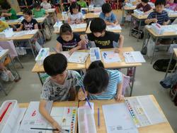 今日の図工では絵の具セットのつかい方を学習しました。パレットにならぶ様々な色の絵の具に心をウキウキさせながら、画用紙に思い思いの線や模様を表現しました。水彩絵の具は「水と仲良く、上手に付き合おう」を合言葉に楽しい時間を過ごしました。 |