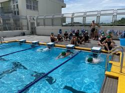 6年生は、3年ぶりとなる水泳学習を進めています。小学校生活最後となる水泳学習、初めは久しぶりだからか緊張した顔も多くみられましたが、学校の友達と泳ぐことが楽しいようで、教室では見られない笑顔が見られました。 友達や自分の命を守るために安全に気を付け、ルールを守って取り組みながら、体を水に任せ、全身で水の冷たさを感じていました。 また泳力別学習では、自分のレベルに合わせたコースを選択し、バタ足の練習やビート板を使った練習、リレーなどを通し長い距離を泳ぐ練習などを行いました。 |