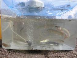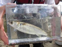 ボラ、アユ、オイカワ、ヌマチチブ、モクズガニなどをスタッフの方が捕獲し…子どもたちは目の前で観察できました。