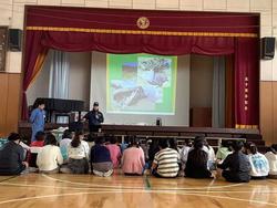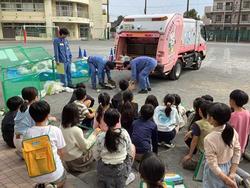 画像や実験を用いて、ごみの分別やごみのゆくえ、環境問題について説明してくださいました。校庭では、ごみ収集の仕事や収集車の仕組について、実際に収集車を見せてもらいながら学ぶことができました。