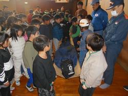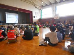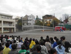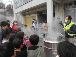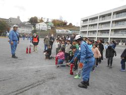 地域の総合防災訓練に全校児童が参加しました。最初に体育館で地域の方々と一緒に、中区役所の方から地震災害等が起こった際に自分たちにできることを「自助」を中心とした話を聞きました。その後はクラスごとに仮設トイレ設置や消火器の使い方、炊き出しなど、災害に備えた活動を見学したり体験したりしました。3年生は社会科で消防署など地域の安全を守るしくみの学習をしていたので、よく知っていて、「さすがだなあ」と思いました。最後に消防団の放水訓練をみんなで見学しました。災害が起こらないにこしたことはありませんが、いつ起こっても対処できるように意識することが大切だということを学びました。