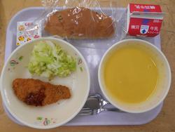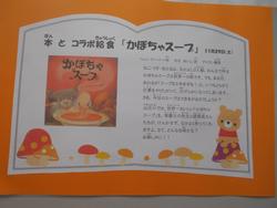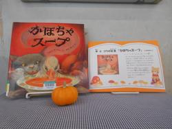山元小では、毎年図書室にある絵本に出てくる不思議な料理が給食の献立になります。今までに「ドラキュラのスープ」などが献立になって給食で提供されました。今回は「かぼちゃスープ」です。子どもたちは図書館司書の先生から読み聞かせを聞いて、「どんな味かな?」と興味津々です。お話の中で登場する、ねこ、りす、あひるはスープをつくるときに大げんかをしてしまいましたが、給食調理員さんたちはなかよく協力しておいしいかぼちゃスープをつくってくれました。