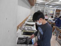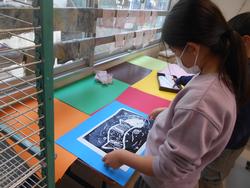4年生の図工で初めて彫刻刀を使って版木を彫って版画を作りました。「○○している生き物」というテーマでそれぞれがイメージした生き物の版を作りました。版木を彫っては刷りを繰り返す中で、自分のイメージした彫りに合う彫刻刀を選んだり彫り方を変えたりしていました。また、線彫りや面彫りも意識しながら版を彫り進めていきました。試行錯誤を繰り返した結果、最後に刷り上がった作品の仕上がりを見て子どもたちは満足そうでした。