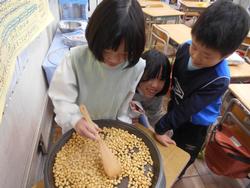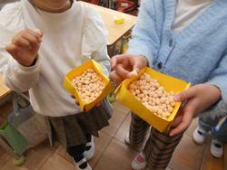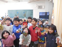 今年は2月3日が節分です。2日の朝会でも校長先生から赤鬼や青鬼以外にもいろいろな色の鬼がおり、赤鬼はなんでも欲しがる鬼、黒鬼は人のせいにする鬼など、それぞれの色によって違いがあり、その人その人で追い払う鬼が違う、という話がありました。また、初午と同じように、給食の献立にイワシや豆を使ったメニューが出たり、豆まきなどをするクラスがあったりしました。2年生は大豆を煎って食べたり、節分飾りの柊鰯を作ったりしました。柊鰯は本来は柊の枝に焼いた鰯の頭を付けるのですが、給食の献立に出た鰯の頭がもらえないかと給食室に行きましたが、最初から頭のない鰯を調理したためもらえなかったので、折り紙で作りました。豆まきの豆は「本物の豆を投げるのはもったない」というので、紙ねんどに着色して子どもたちが1つぶずつ作りました。見た目は本物そっくりです。鬼のお面を持ってきた子がいたので、鬼を交代でしながら豆まきを楽しみました。明日は立春、春はもうすぐです。
