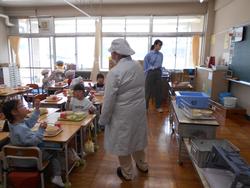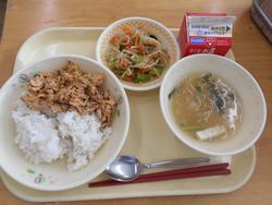 今年度の給食が始まりました。子どもたちは朝から献立表を見ながら給食の時間を楽しみにしていました。この日の献立は、ごはん、ツナそぼろ、みそ汁、牛乳でした。1年生は初めての給食当番です。子どもたちは声をかけ合いながら配膳して、1回目の給食とは思えないくらい早い時刻には喫食が始まって会食を楽しんでいました。この日はどのクラスもほぼ完食で給食室に食缶を返すことができました。