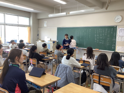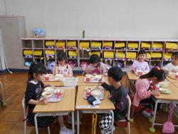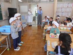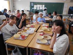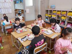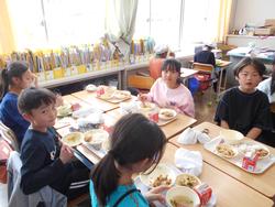 入学して1週間、1年生も給食が始まりました。自分たちで給食当番の配膳したりカフェテリア形式で自分の給食を受け取ったりしながら、給食の準備をしました。栄養士の先生に食事のマナーを教わったり、準備から後片付けまでの流れを確認したりしながら、給食を食べていました。最初は緊張気味でしたが、すぐにグループで楽しそうに会食しながら過ごすことができるようになりました。来週から牛乳パックの開き方を練習する予定です。