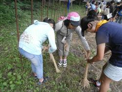 | 2日目は午前は河原でグループごとに石を組んでかまどを作り、すいとんを作って食べました。午後は沢登りとグランドゴルフに分かれて活動を楽しみました。沢登りはみんなびしょぬれになって帰ってきました。 | ||