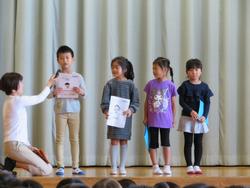朝会で、夏休みに取り組んだ読書感想文の表彰を行いました。その後、1年生が今月の生活目標の振り返りを発表しました。 |