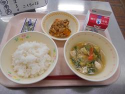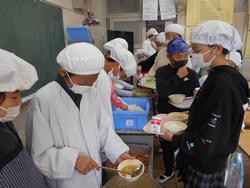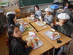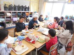 今日の給食の献立は5年1組と6年1組の育てた白菜の入ったたらちりでした。この日はちょうどたてわり給食の日にもあたり、収穫祭前のいそがしい中でしたが、1年生から6年生までがそろって異学年交流をしながら楽しく会食することができました。