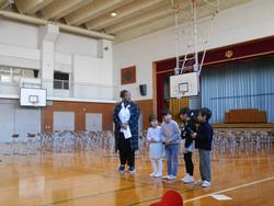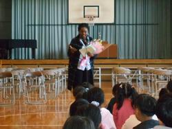 今年度のAET(アシスタントイングリッシュティーチャー)のJB先生とのお別れの会が開かれました。今回は1年生が司会を務めました。全校の拍手で入場してきたJB先生に、5年生の代表児童がお別れの言葉を、4年生の子から全校児童の寄せ書き帳、2年生の子から花束が贈られました。JB先生とは1年一緒に勉強しましたが、いつも明るく踊ったり話したりしながら子どもたちと接してくださいました。最後に3年生の代表児童と一緒に全校の拍手とともに見送られて会が終わりました。