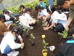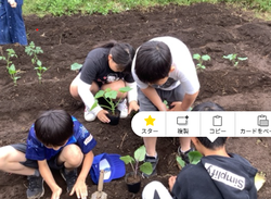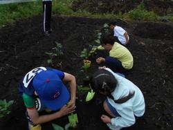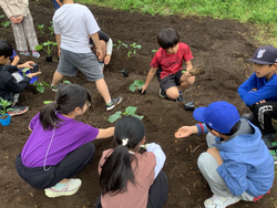 夏野菜の苗やタネが届いたので、クラスごとに育てたい野菜の苗を畑に植えました。天候が心配されていたので、農園には次々と届いた苗を抱えた子どもたちがやってきて先日作ったクラス畑の畝に植えていきました。苗のないポップコーンやスナップえんどうなどはタネを蒔きました。育てた夏野菜は7月のミニ収穫祭で天丼やクラス調理の材料になります。草取りや支柱立てなど世話が大変ですが、収穫を楽しみに栽培活動に取り組んでいきます。