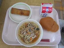 この日の給食はサンマーメンと春巻きなど、横浜にゆかりのある献立でした。サンマーメンは横浜で生まれた料理で、いろいろな野菜を炒めてとろみをつけた餡がかかったラーメンです。寒い季節に体が温まるので、港で働く人たちに好まれて広まったそうです。春巻きも横浜中華街の発展とかかわりの深い料理です。パンもパン屋が日本ではじめて開業したのが横浜なので、これも横浜ゆかりの食べ物といえるかもしれません。横浜は外国との窓口として発展してきた都市なので、横浜発祥の食べ物がたくさんあります。給食のメニューを通して横浜の食文化に興味をもってほしいです。