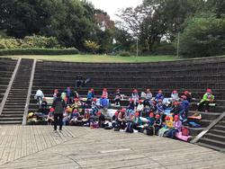 お家から持ってきたお弁当は野外ステージ一人ひとり間隔を取りながら食べました。