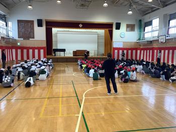 式の終了後、各学年の間をを6年生が歩き、全校児童からの拍手が送られました。