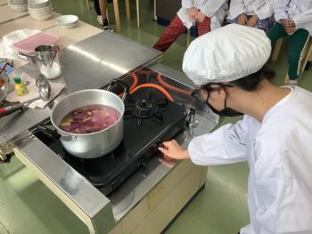1、2、3時間目に、みんなで育てたプール前の畑のサツマイモを使って、『サツマイモのレモン煮』を作りました。