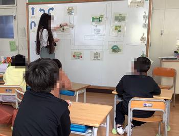 次に、自分の町の地図(マップ)を書きました。その中で、英語で道案内をしました。