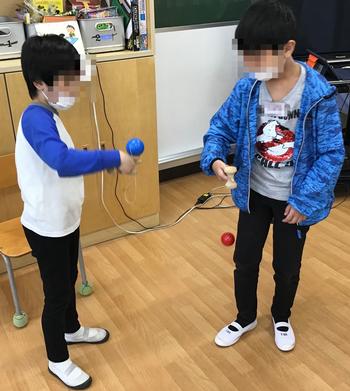 4時間目、生活科で、おはじき、お手玉、けん玉、輪投げ等の『昔の遊び』に取り組んでいます。