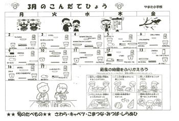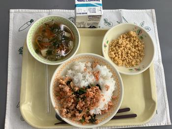 今日の給食では、ひなまつりをお祝いする献立として、さけのピンク色をももの花に、たまごの黄色を菜の花に見立てた、菜の花ごはんが出ました。