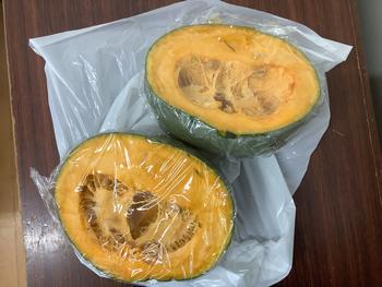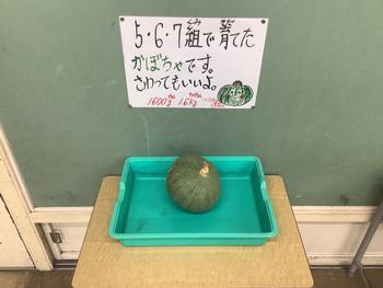 今日、収穫して5、6、7組に飾っていたカボチャを切ってみました。