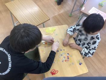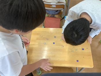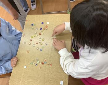 今日は、二つのおはじきをあてたら取っていく遊び方で、ペアーやグループでルールを守り楽しく遊びました。