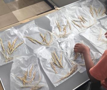 稲の脱穀は、脱穀機を使うところを、今日は、シャーレのフタに挟んで行いました。