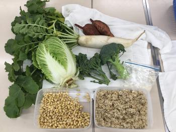 来週の月曜日、山田小の畑でとれたもの(大根、白菜、ブロッコリー、米、大豆、サツマイモ)で調理実習をします。