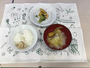 大根、白菜、サツマイモ、ブロッコリー、米(玄米)、大豆等、山田小学校の畑で栽培した新鮮なもので、『ご飯、みそ汁、大豆と大根の煮物、ブロッコリー』を作りました。