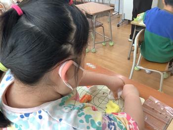 3、4 時間目、図工の時間に、粘土に色を混ぜて、イメージしたものを形にしていきました。