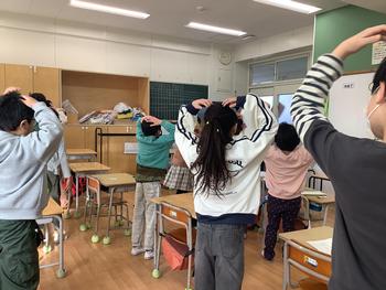 ② 今日の学習は、いろいろな体の動き「Walking(歩く)、Dancing(踊る)、Running(走る)」等を組み合わせて、体を動かしながら歌いました。