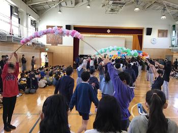 3時間目、体育館で、風船バレーとドッジボールをしました。