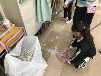 ちゃんと隅々までちゃんとできているか、ほうきとちりとりはちゃんと使えているかを確認するために、シュレッダーのゴミを、7組の教室の床に、いっぱい撒き散らしました。