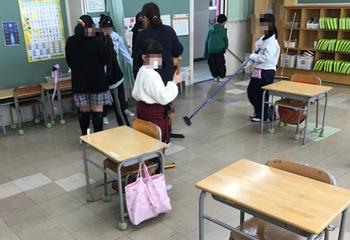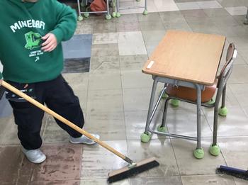 『一つのゴミも残さずに掃除できるかな?』と言って、全員7組の教室に集まり、まず机と椅子を前にして、ほうきかちりとりかを持って、ゴミを集める場所を決めて、集めて取りました。