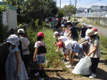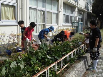 45組の前の花壇では、さつま芋がぐんぐん成長しています。収穫予定の10月末に向けて、朝からみんなで雑草を抜きました。
