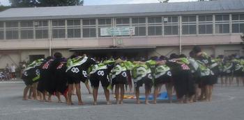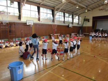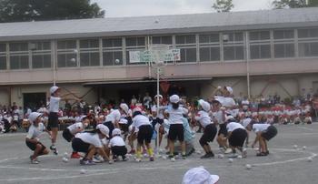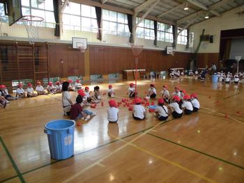 体育館では、1年生が紅白に分かれて玉入れの練習をしています。チェッコリダンスもがんばってます!