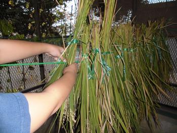 ▲元飼育小屋で稲架(はさ)掛けしているので、雨や食害も安心です。