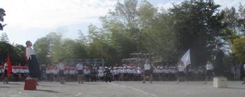 音楽隊の演奏とともに、運動会の幕が上がりました。実行委員長の挨拶に続き、応援団による見事なエール交換が行われ、会場は一気に盛り上がりました。