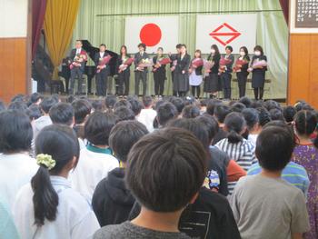 離任式では、これまでお世話になった職員の皆さんとのお別れをしました。卒業生、保護者・地域の皆様にも参加していただきました。卒業生もたくさん集まり、別れを惜しみました。最後は、全校で校歌を合唱して締めくくりました。