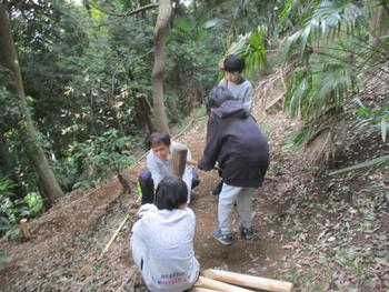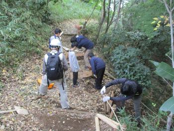 当日は、ボランティアとして、児童、職員、たぬきクラブのみなさん、森林インストラクターのみなさんとで力を合わせて、森の中の歩道の整備や落ち葉の清掃などを行いました。