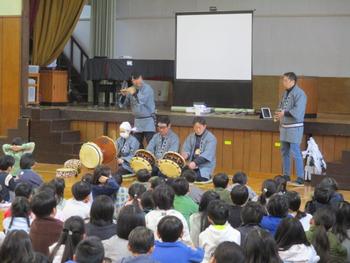 本日、下谷本囃子保存会のみなさんが来校し、伝統のお囃子を披露してくださいました。