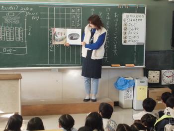 1年生の教室では、みんなじっと耳と目を傾け、お話の世界に入り込んでいました。