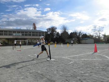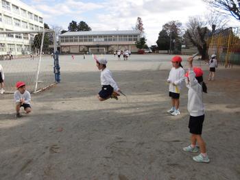 校庭では、1年生がなわとびに、3年生がTベースに取り組んでいます。
