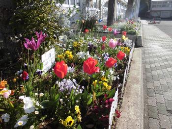 校庭の花壇には、やもりん隊のみなさんがこの冬に植えてくださっていた花々が咲き誇っています。