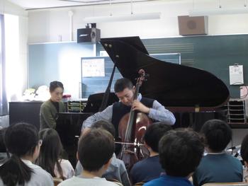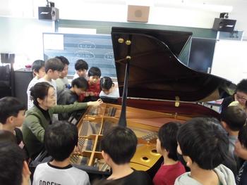 演奏だけでなく、チェロの仕組みや音の出る仕組みについての説明もあり、児童たちは興味津々。ピアノの周りに集まり、鍵盤や内部の構造を見ながら、トルコ行進曲に合わせて手拍子を楽しむ場面もありました。