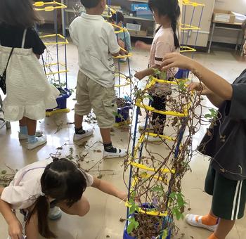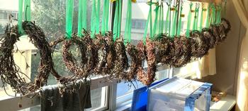 大切に育ててきた朝顔のつるを丁寧にほどき、朝顔リースを作りました。